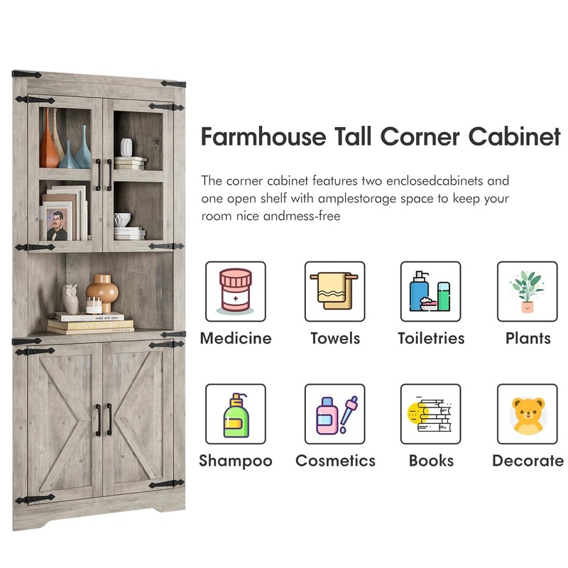 - Farmhouse Corner Cabinet: The barn door design adds a delightful rustic charm, enhancing the aesthetic appeal of your living room, kitchen, or bathroom with its beautiful and inviting style