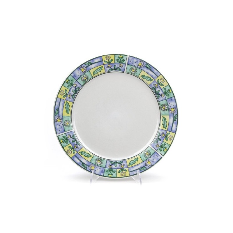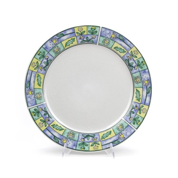 - Daisy Field by Sakura, Stoneware Dinner Plate, Active Pattern: No, Circa: 1998, Size: 10-1/2" Diameter, Majesticware, Daisies on a blue, yellow and green backgrounds bordering a white plate., Plate used for holding the main meal.