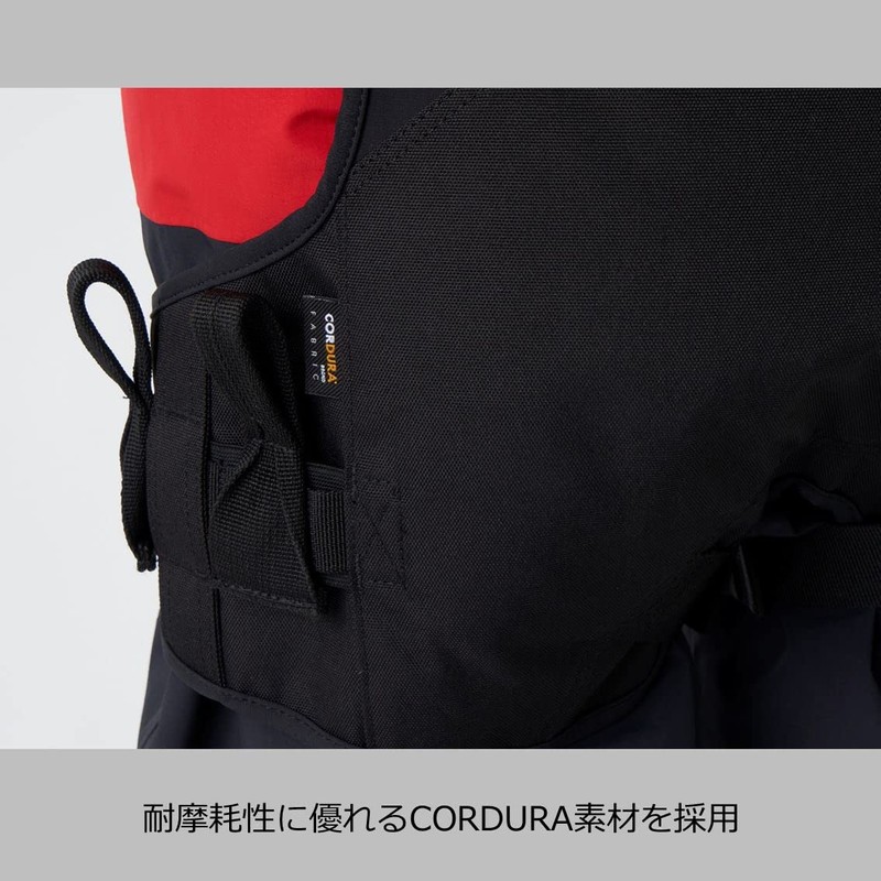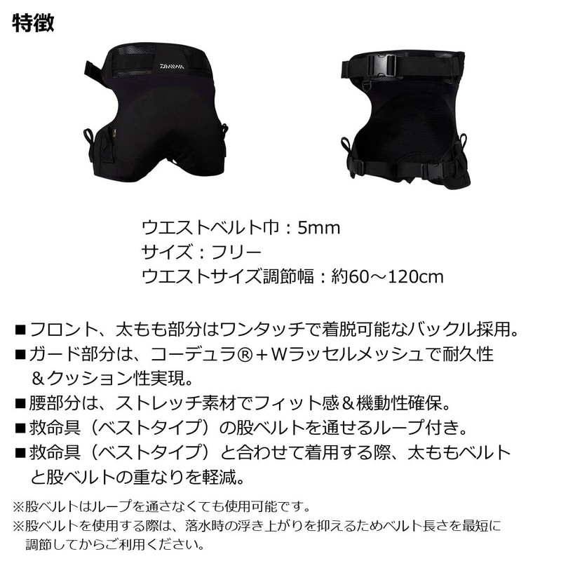 - The waist part is made of stretch material to ensure a fit and mobility, and the lifesaving device (vest type) with loops that can pass through the crotch belt (vest type) to reduce the overlap of the thigh belt and crotch belt