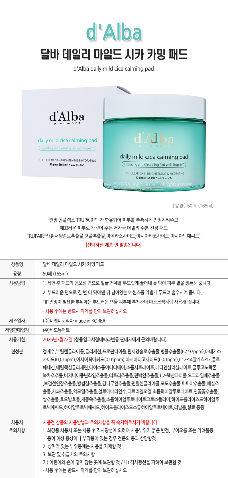 Dalba Daily Mild Cica Calming Pads 50 Sheets / 달바 데일리 마일드 시카 카밍 패드 50매