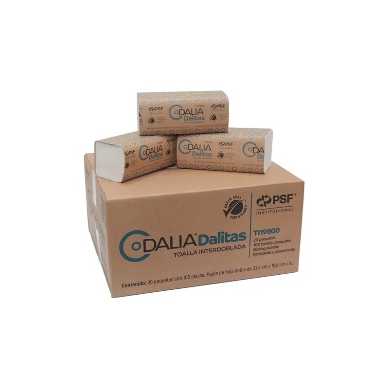 Descripción Limpia: Toalla interdoblada Dalitas TI19800 caja con 20 paquetes de 100 piezas, sumando un total de 2000 piezas con hoja doble.