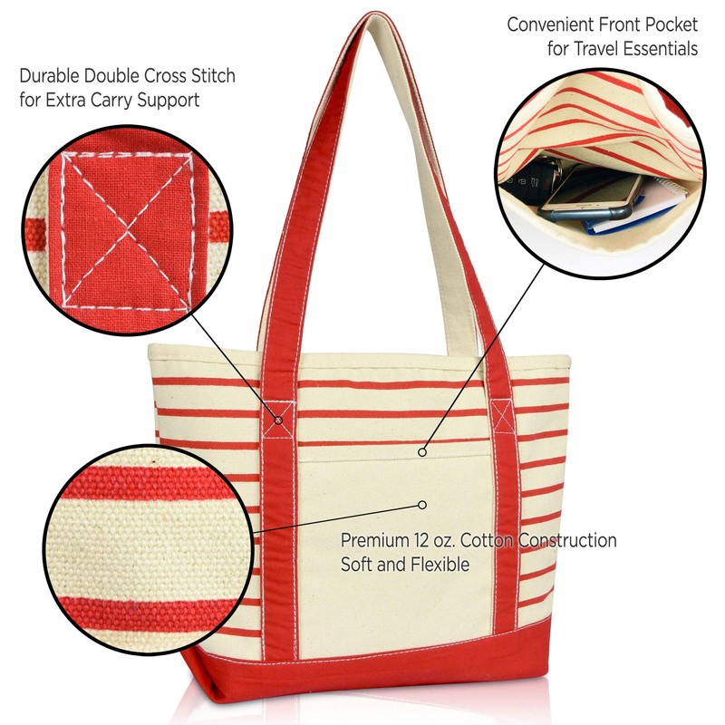 DALIX Large Stripe Tote Deluxe Shoulder Bag Cotton Canvas in Red