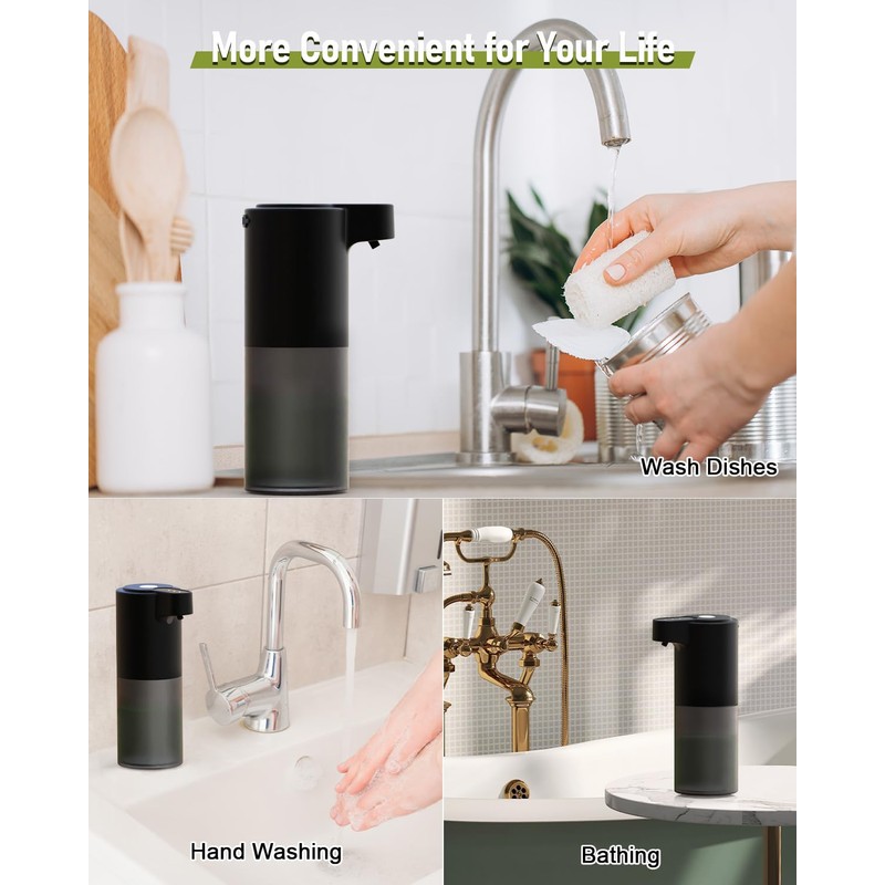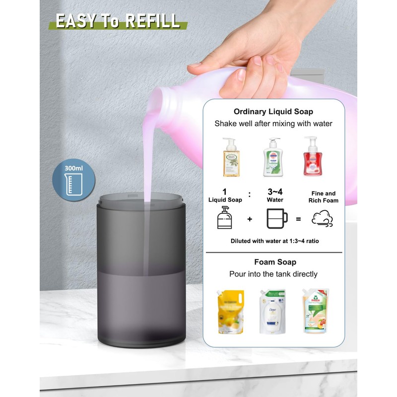 - IPX5 waterproof: the capacity of the sensor soap dispenser is 300 ml. A single addition of hand sanitizer can be used for a long time without the need to refill frequently. Dishwashing liquid, shower gel and hand soap can be loaded directly into this electric soap dispenser, it can be used in bathroom, kitchen, nursery, hotel, school, restaurant, etc. If you have any questions about the product, please contact us.