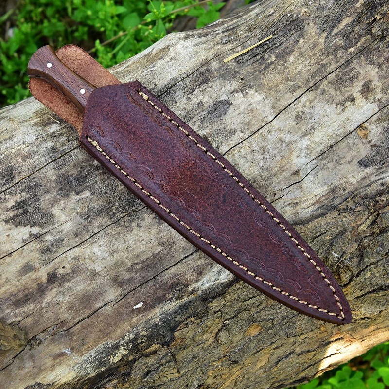chromium-rich alloy carbides in the steel. D2 provides an effective combination of wear resistance and toughness. D2 holds an edge very well. When needed, use a Diamond Wet Stone or better to re-sharpen the blade at 20-degrees. When done using the knife, wash it is soap and water, dry completely, coat in gun oil and store away from the sheath. Leather pulls moisture out of the air and can rust the blade if stored improperly.