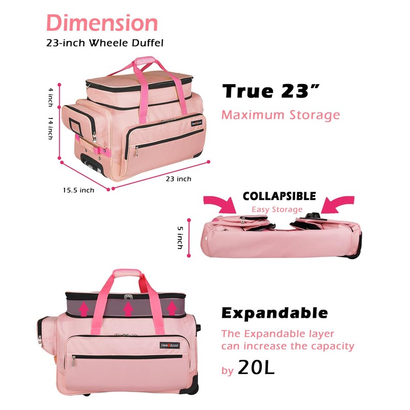- Maximum Storage: Size 23x15.4x14''.true 23” luggage space with molded drop-bottom compartment allow duffel to self-stand when Fully packed.Everything you need for dance competition, a major show, or your world tour.And holds more than 12 costumes (Maximum 25 lbs).It expands to nearly 5 feet tall and is made with automatic height locking pull rod by Zinc alloy