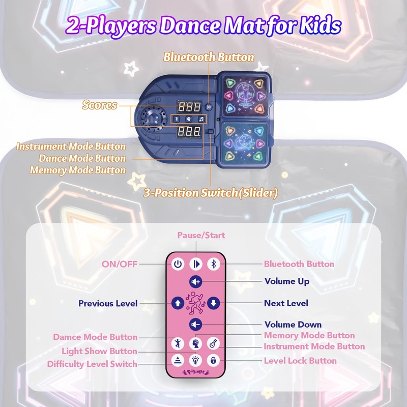 - 5 Fun Challenging Games: Dancing / Bluetooth / Memory /Instrument/Light Show Function.Dancing Mode--Kids dance follow the floor mat from easy to hard mode.Bluetooth Mode--To play your favorite tracks via BLUETOOTH, be your own master and enjoy the funny of dancing hours. Memory Mode--Just follow the light-up button to copy step. Instrument Mode--Do Re Me Fa..dance to your own beat.Light Show Mode--Colorful music and light show.Help body exercise and memory development while exercising in the funniest way possible