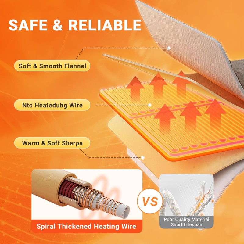 - Soft & Skin-Friendly: Made from plush flannel on one side and cozy sherpa on the other, this heated blanket offers luxurious softness and excellent insulation. It feels warm and inviting even without power—perfect for snuggling up on chilly days or winding down after a long day.