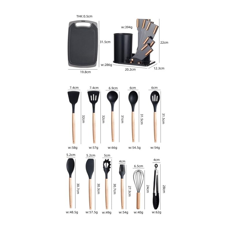 - 🍲 **COMPLETE KITCHEN SET**: This set includes 1 Soup Ladle, 1 Draining Spoon, 1 Solid Spoon, 1 Pasta Server, 1 Slotted Spatula, 1 Solid Spatula, 1 Scraper, 1 Scraper Spoon, 1 Oil Brush, 1 Set of Tongs, 1 Whisk, 1 Chef Knife, 1 Bread Knife, 1 Universal Knife, 1 Utility Knife, 1 Paring Knife, 1 Pair of Scissors, 1 Cutting Board, 1 Knife Block & Utensil Holder.
