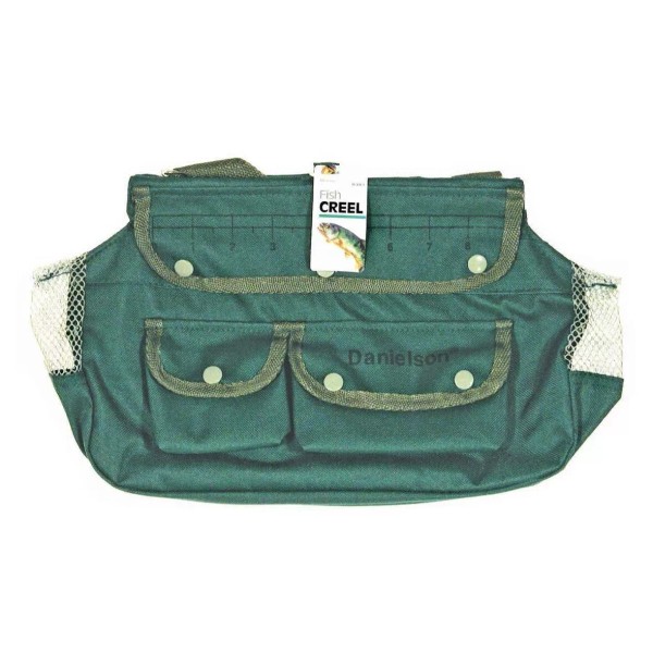 Danielson Creel Canvas 15" - Fish can be conveniently stored and carried with this top-quality 14-1/2" x 9" fabric creel with vinyl lining. Features include an adjustable shoulder strap, two snap-closure compartments, nylon mesh side vents and a convenient silk screened ruler. Creel with vinyl lining
