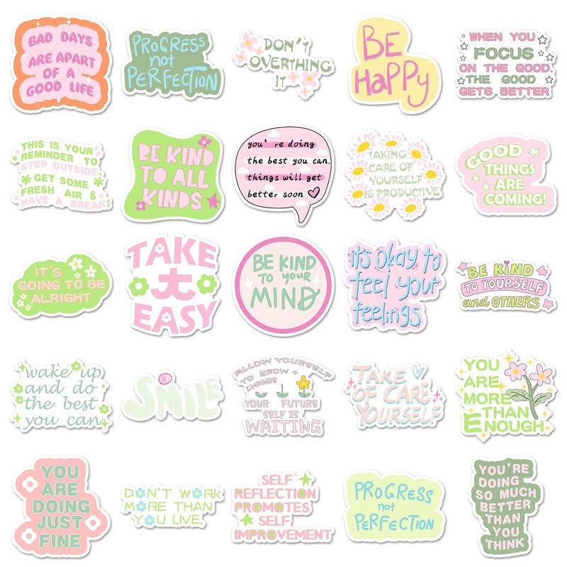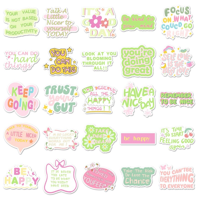 Danish Pink Inspirational Stickers for Kids Teens Girls, 50 PCS Cute Preppy Aesthetic Decor Laptops Decals for DIY Book Bedroom Phone, Cartoon Danish Pastel Motivational Phrase Sticker