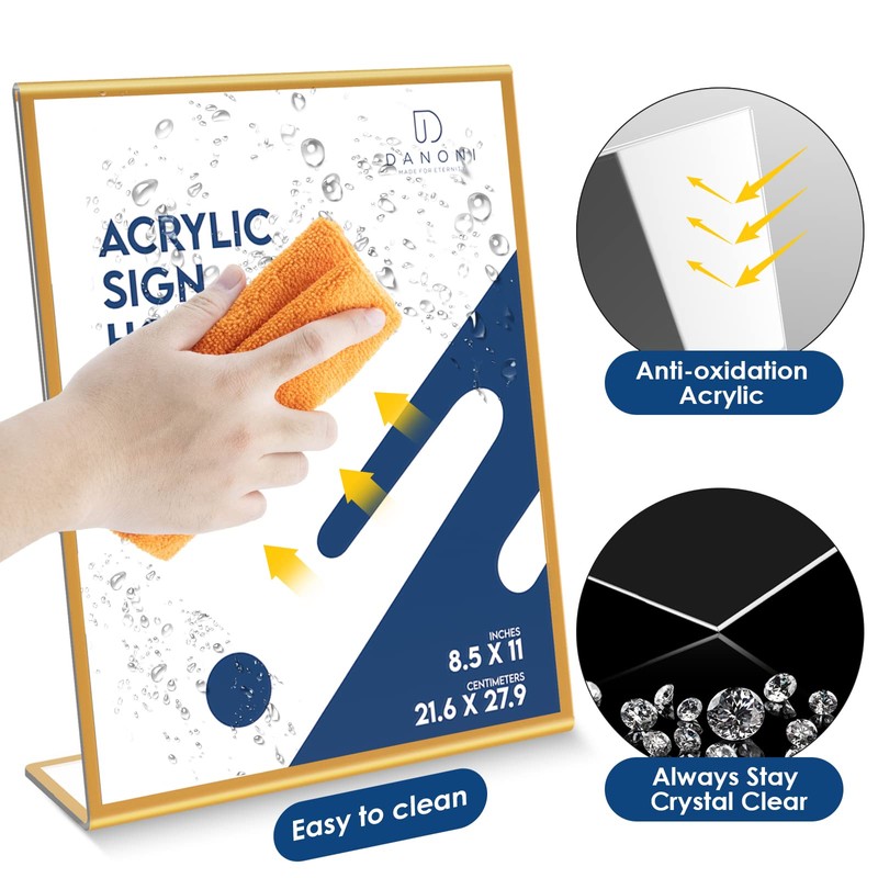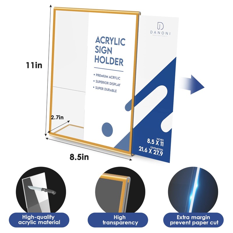 danoni Acrylic Gold Frames Sign Holders - 6Pack 8.5x11'' Flyer Document Brochure Display Holders with Vertical Slant Back for Office Desktop - Plastic Table Menu Stands Plastic Paper Holders