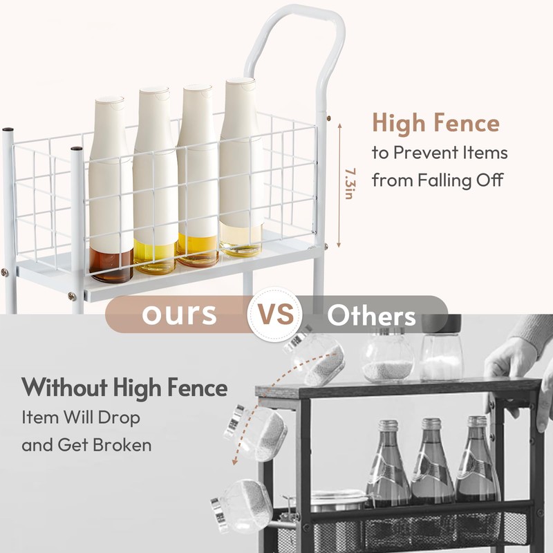 High Mesh Fence: The top shelf features high mesh fence to protect your items from falling off. When you use the narrow kitchen cart in kitchen, you can put higher items like red wine, seasoning on the top tier to get them protected.