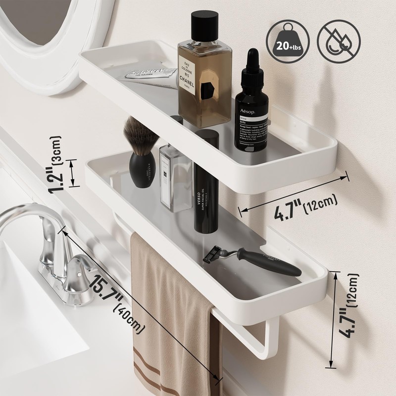 - Complete Set: Includes two 16-inch shelves, one with a towel bar and one without, offering versatile storage solutions for your bathroom