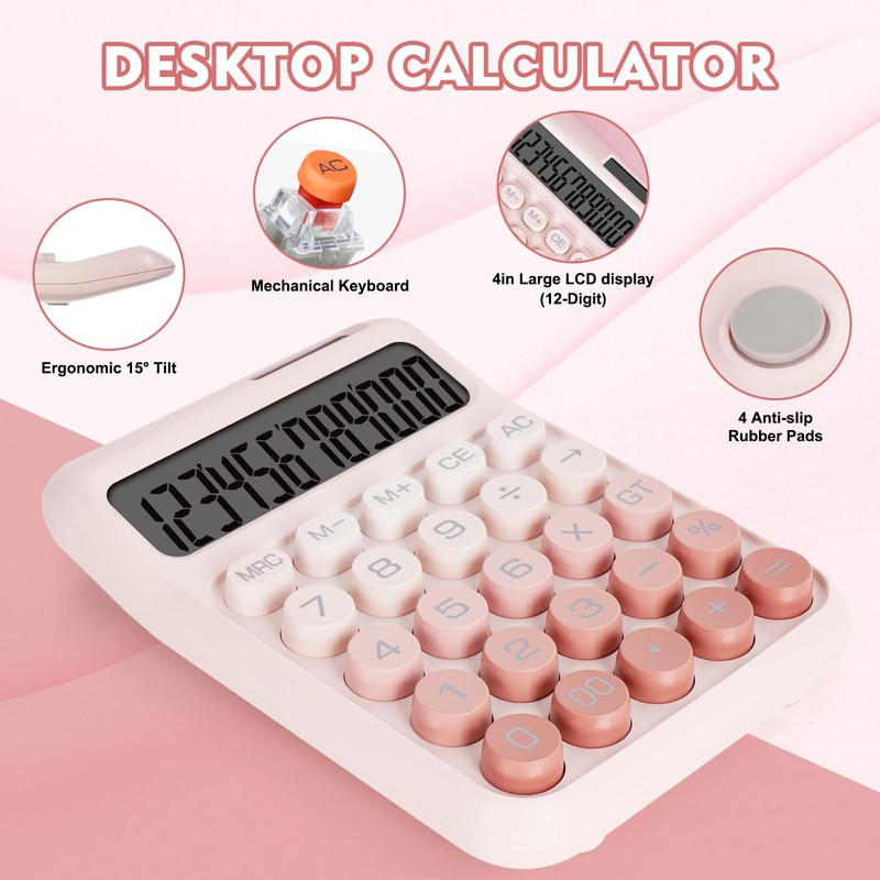 DANRONG Mechanical Switch Calculator with Big Buttons, Calculators Desktop, 12 Digits, Solar Battery Power, Desk Calculator, Large LCD Display, Cute Pink Calculator for Teachers Students Basic Office
