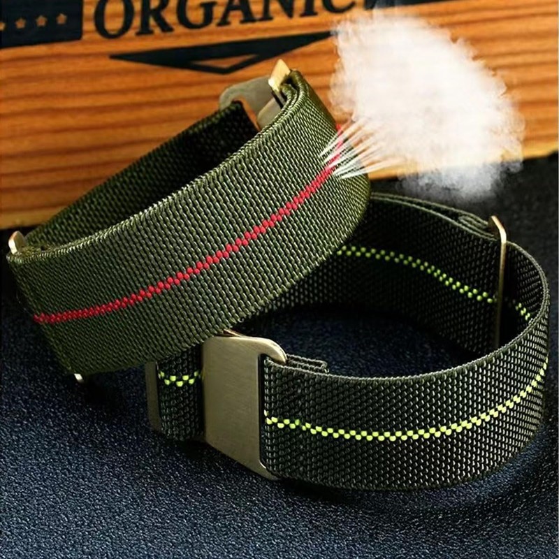 - High Quality:This paratrooper-style strap is made from super stretchy nylon-like fabric elastic to ensure a perfect fit for any wrist size. This material has an exceptionally tight yet breathable, soft Twill Weave of polyester and rubber, with reinforced edges that prevents unraveling and shape change when stretched. Danxancy MN style watch strap finish your timepiece deserves.