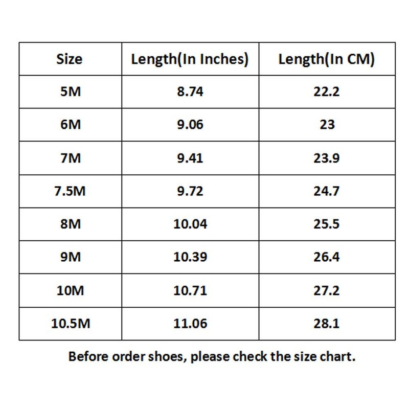- Sizing: 5M US: 8.74"/22.2cm; 6M US: 9.06"/23cm; 7M US: 9.41"/23.9cm; 7.5M US: 9.72"/24.7cm; 8M US: 10.04"/25.5cm; 9M US: 10.39"/26.4cm;10M US: 10.71"/27.2cm; 10.5m US: 11.06"/28.1cm