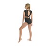 - Girls "Yasmin" micro-cap sleeve leotard features a wide neck with satin elasticized binding