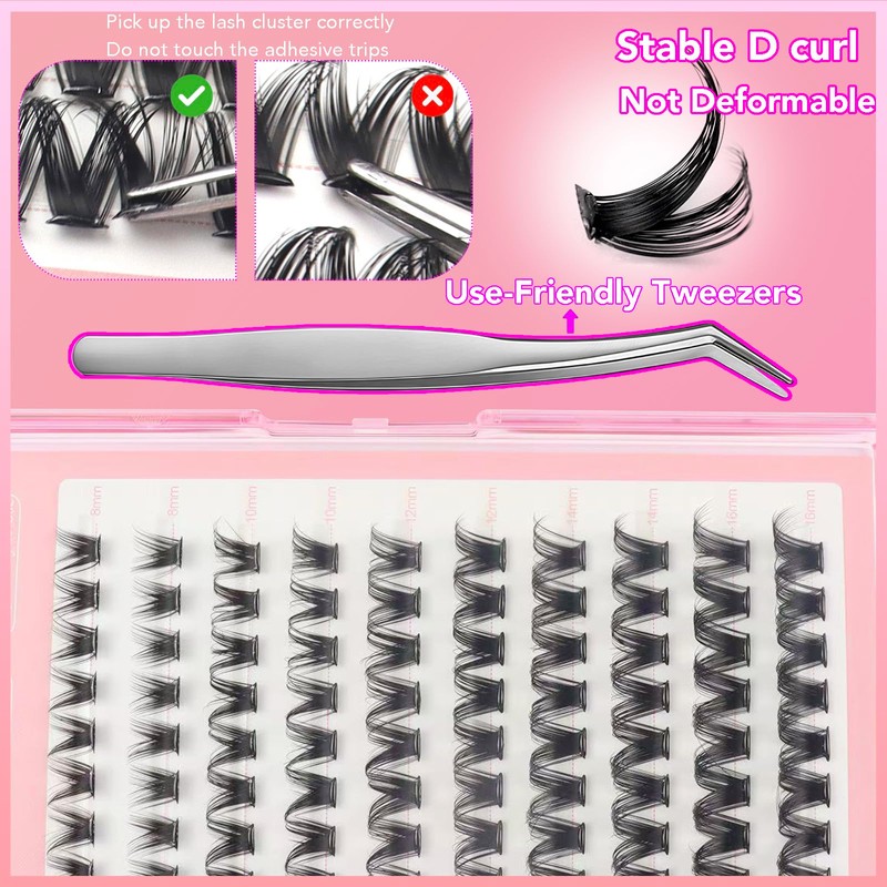 • 8-16MM Mixed Length - These self-adhesive eyelash extensions have an ultra-thin band that ensures a wispy effect, a soft and comfortable wearing experience, and seamless blending with your natural lashes—making them suitable for all eye types. Our pre-bonded wispy lash clusters come in mixed lengths, ranging from 8mm to 16mm ( 8mm, 10mm, 12mm, 14mm, and 16mm), allowing you to DIY a natural salon-worthy look or your own unique style. With a little practice, even beginners can easily master the application and achieve professional-level results.