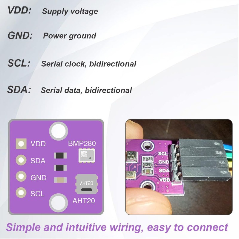 - PACKAGE INCLUDES: 5 x AHT20 + BMP280 Temperature Humidity Pressure Module;5 x 4-pinheader;20 x Male and female Connect cable