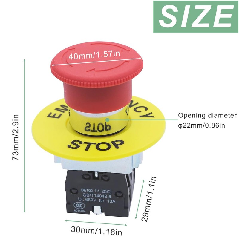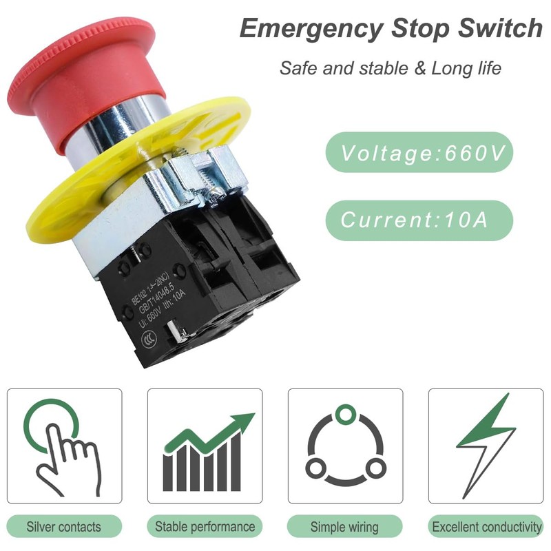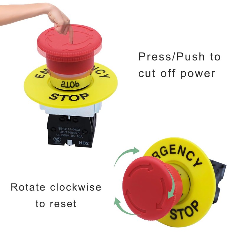 - Easy to use: Press the red button to emergency stop, rotate clockwise to reset.
