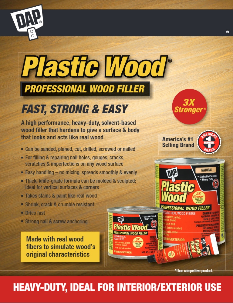 DAP Plastic Wood Professional Wood Filler is Fast, Strong and Easy to use. This high performance, heavy-duty, solvent-based wood filler hardens to give a surface and body that looks and acts like real wood. Ideal for filling and repairing nail holes, gouges, gracks, scratches and imperfections on any wood surface. Plastic Wood Solvent can also be stained.