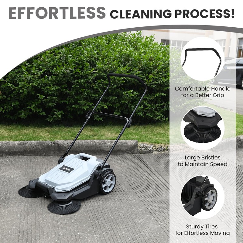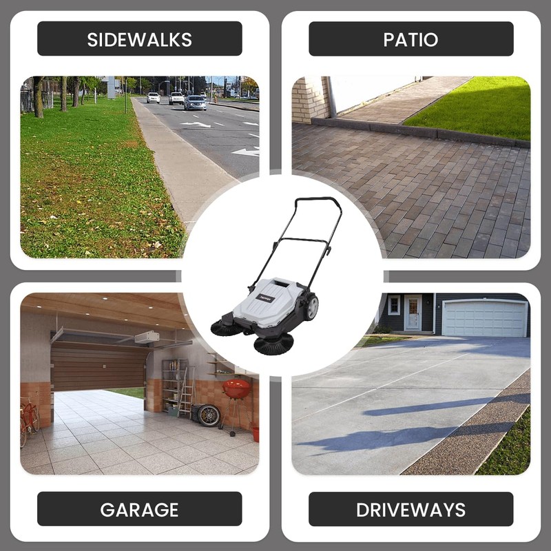 - HUMAN-POWERED PUSH SWEEPER: Perfect for a range of surfaces such as sidewalks, patios, garages, workshops, driveways, and more. This sweeper is specifically designed for efficient hard floor sweeping, offering reliable performance across various settings.