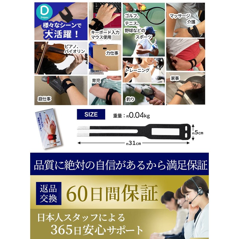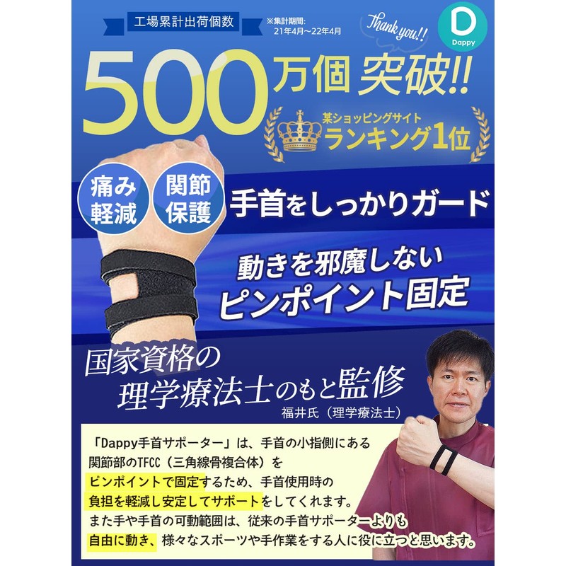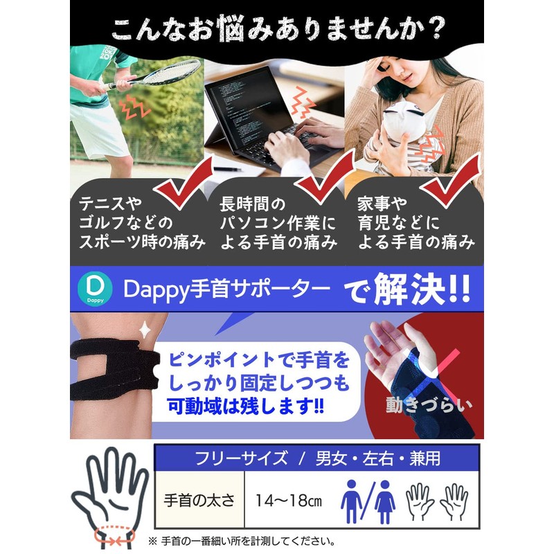 - 【圧倒的な固定保護と回復サポート機能】「Dappy」の手首サポーターは高い固定力・圧迫力で手首を強力サポートします。お客様のお声をもとに、より強力なマジックテープに改良し、手首をしっかり固定します。TFCC、腱鞘炎、家事、スポーツや力仕事におススメのサポーターです。 ※TFCCとは三角線維軟骨複合体損傷(Triangular Fibrocartilage Complex損傷)のことです。