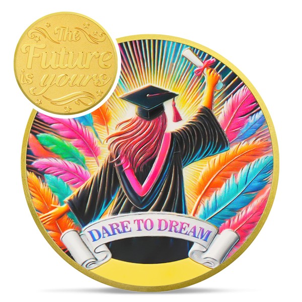 - 🎓Dare to Dream: This vibrant, one-of-a-kind graduation coin is the perfect symbol of your graduation and the exciting journey ahead! With a bold 'Dare to Dream' message, a grad ready to take on the world, and colorful feathers representing freedom and new opportunities, Lucky coin is packed with all the positive vibes you need. Keep it in your pocket or wallet as a reminder to always chase your dreams and embrace the endless possibilities waiting for now go make your dreams a reality