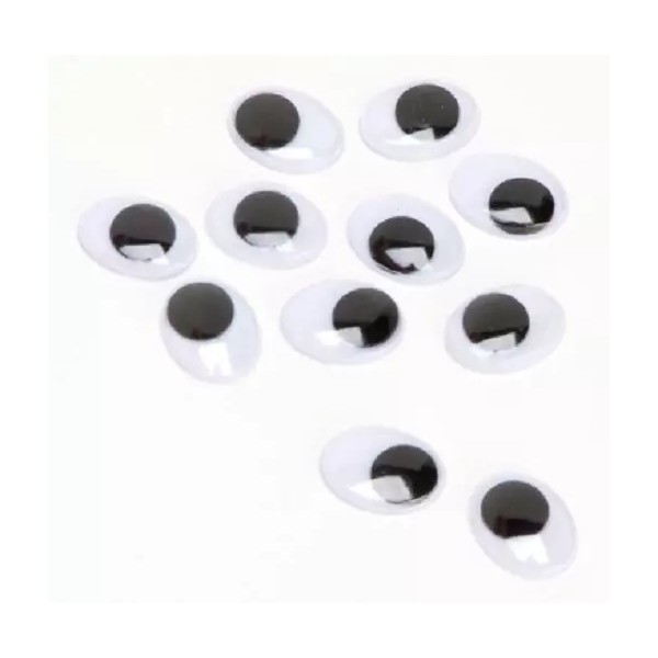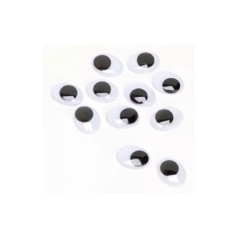 10 mm (25/32" or .393")oval paste-on black and white wiggle eyes. The oval shape gives your crafts a whimsical look. These are all new in bags with cardboard headers. There are 10 eyes per package.