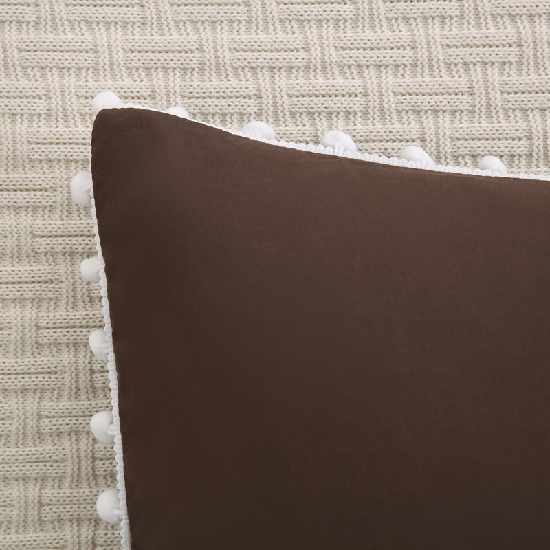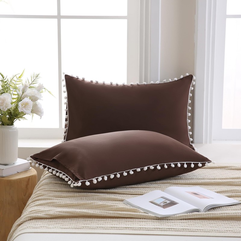 Dark Brown Pom Poms Pillowcases, Standard Queen Size Pillow Cases Set of 2, 100% Washed Microfiber,Chocolate Ball Fringe Pillow Cover, 2 Pack