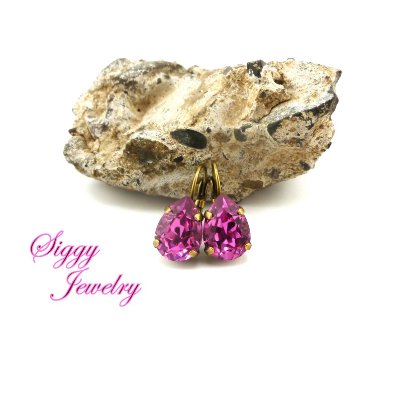 Dark Rose Pink Pear Shaped Earrings Made with Genuine Austrian Crystal, Drop Lever Back, Teardrop, Bridesmaids Gift, Assorted Finishes