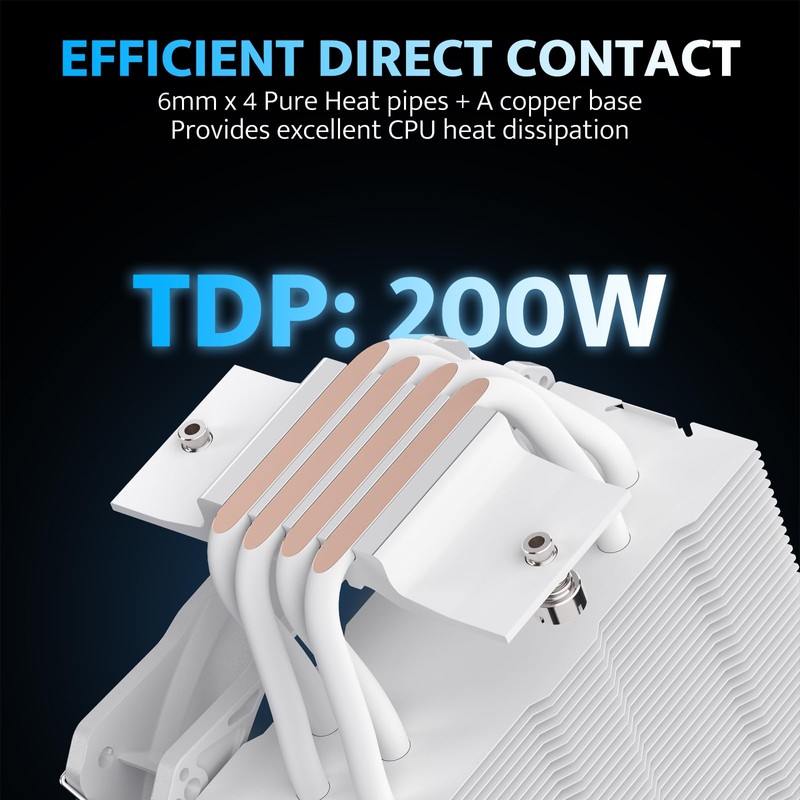 - [Robust Cooling] Offers powerful 200W TDP cooling efficiency through four high-performance Ф6mm heat pipes utilizing HDT technology. The specially designed cooling base with direct contact effectively absorbs heat from the CPU, ensuring efficient heat dissipation.