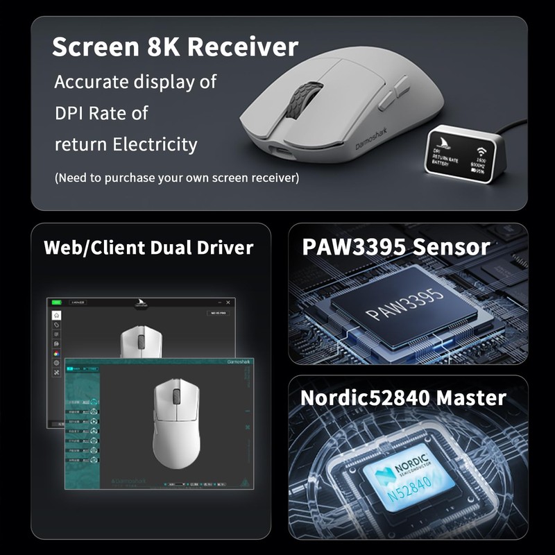 - 【PAW3395 Sensor】Darmoshark wireless gaming mouse adopts top 3395 sensor, up to 26000 DPI resolution, 650 IPS tracking speed, response speed can reach 1000/8000Hz, 50G acceleration, faster and more accurate than ordinary mouse, is committed to providing PC gamers the best Gaming experience
