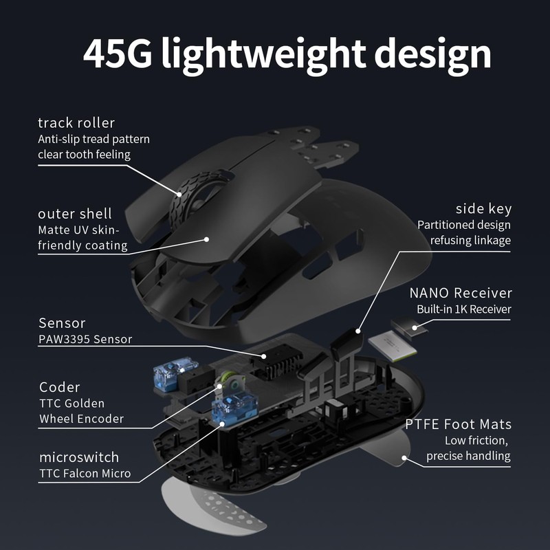 - 【45g Ultralight Gaming Mouse】Pure right-handed ergonomic design, durable and light weight, perfect body design takes good care of various grip hand shapes and easily supports the palm of the hand. Perfect for reducing palm sweating and wrist fatigue during long-term use