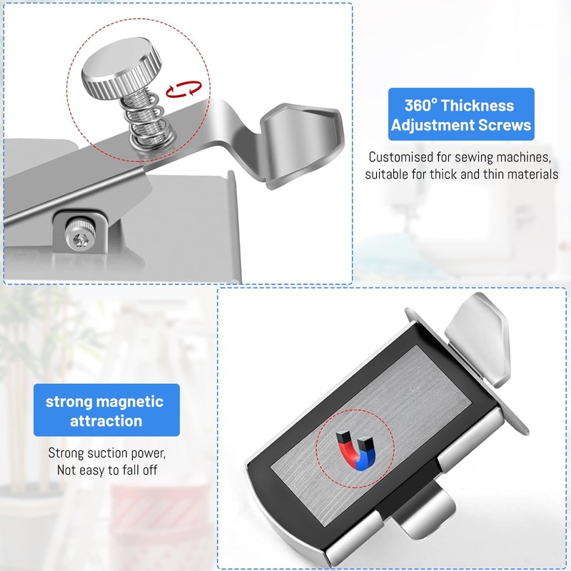 - Easy to use: no installation required. The magnetic seam guide can be easily attached to the sewing machine with the magnet. By adjusting the screw, you can control the thickness of the material according to your needs and perform elegant sewing work.