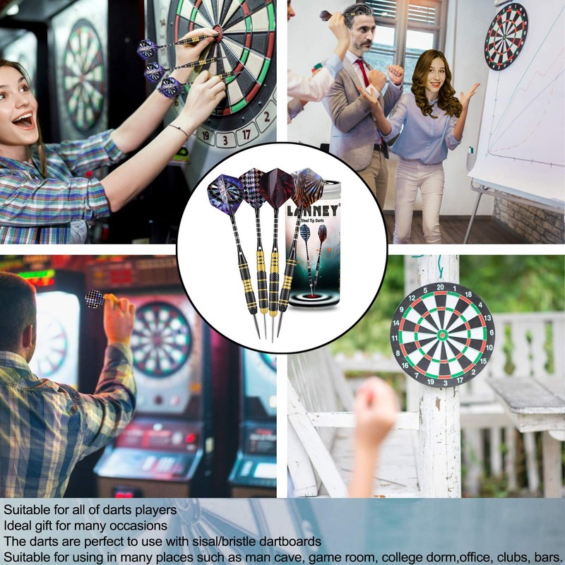 - [MULTIPURPOSE, RISK-FREE PURCHASE] These steel tip darts are perfect to use with sisal/bristle dartboards. The metal tip darts set is perfect for Man Cave, for many purposes such as casual play or game competitions at home, game room, college dorm, office, clubs, bars. If you have any issue with the tip darts set, just contact us and we will reply promptly.