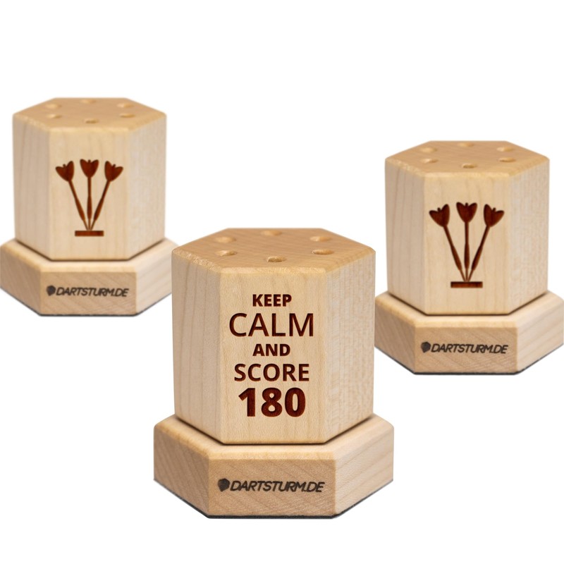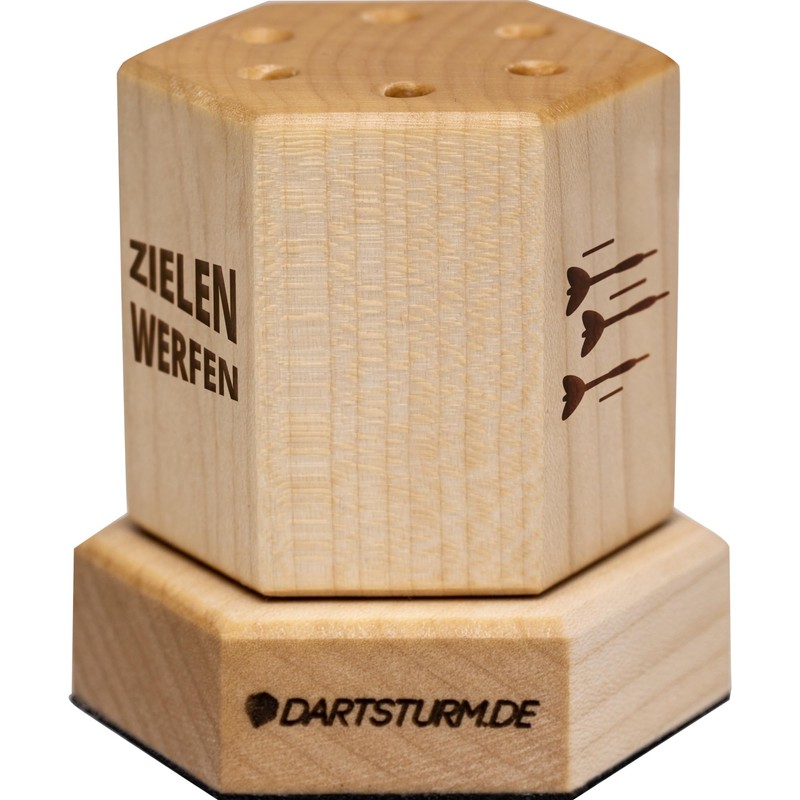 The Mini Tower dart stands from DartSturm.de offer you plenty of space for your dart collection and you can also present your treasures in style. With space for two sets of darts, your favourite sets can be presented perfectly. Thanks to the rotating tower, you always have access to your favourite darts and can easily switch at any time. Each tower dart stand is handmade from high-quality solid wood, which makes each dart stand unique. The column and also the base have an attractive hexagonal shape and both have been oiled with an elegant wood stain. On the base plate, which has been equipped with foam rubber for a non-slip stand, there is our engraved logo on one side as a subtle detail. The Mini Tower is available in three different variations. The different dart designs are each on three sides of the tower. The holes for the darts are suitable for both steel darts and e-darts and are incorporated into the DartSturm.de Tower dart stand at a certain angle. As these high-quality dart stands are made from real wood, the grain and colour of the wood may differ from the pictures.