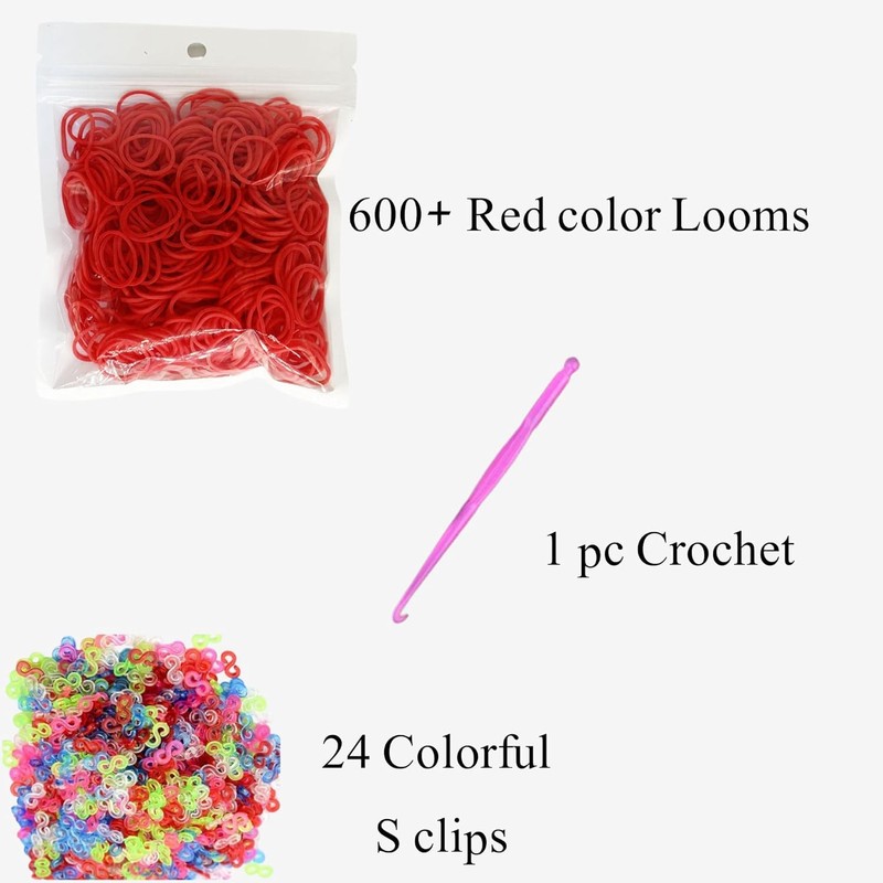 - Complete Crafting Kit: DasKid's pack not only includes 600+Red color loom bands but also a convenient hook tool and colorful 24 S clips. You have all the essentials to kick start your art and jewelry-making projects right away.