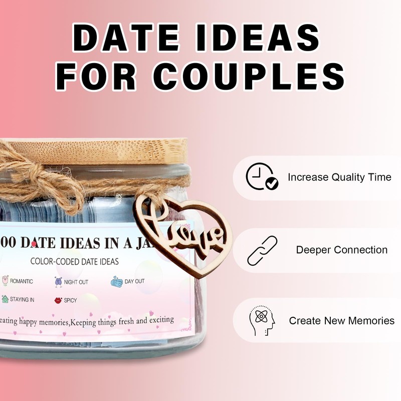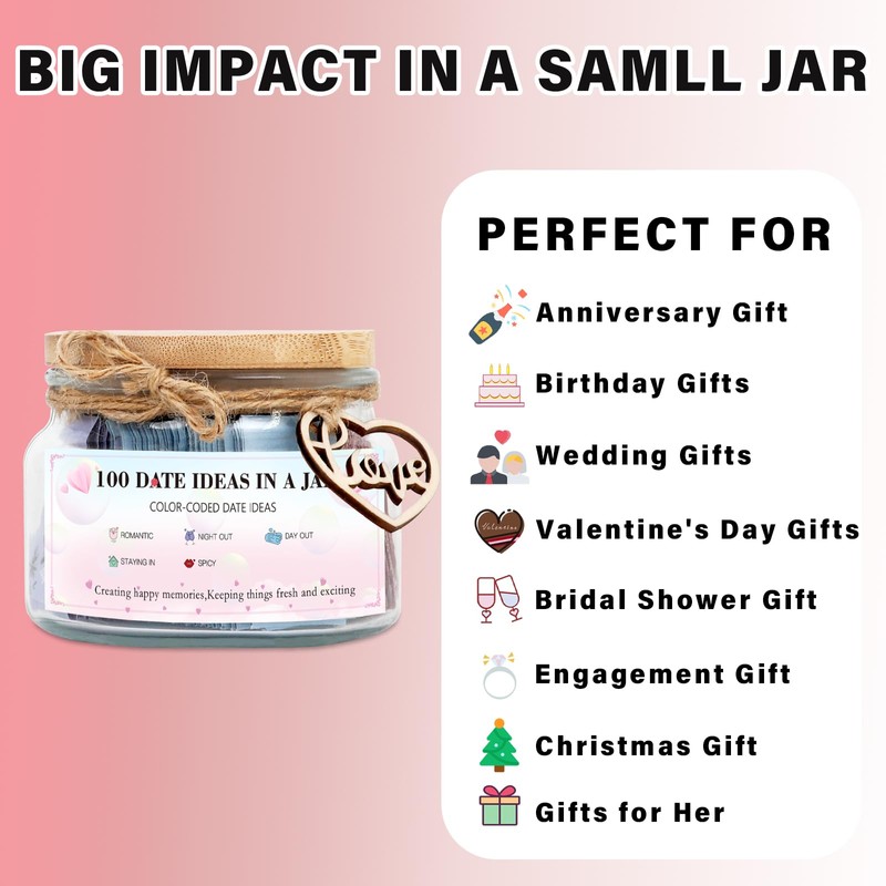 - UPGRADED MYSTERY DATE JAR - 100 interesting and exciting date ideas for couples turning boring date nights into a thing of the past. Your next date will remain a mystery until you open it and once you open a date idea, you must complete it. No takebacks!