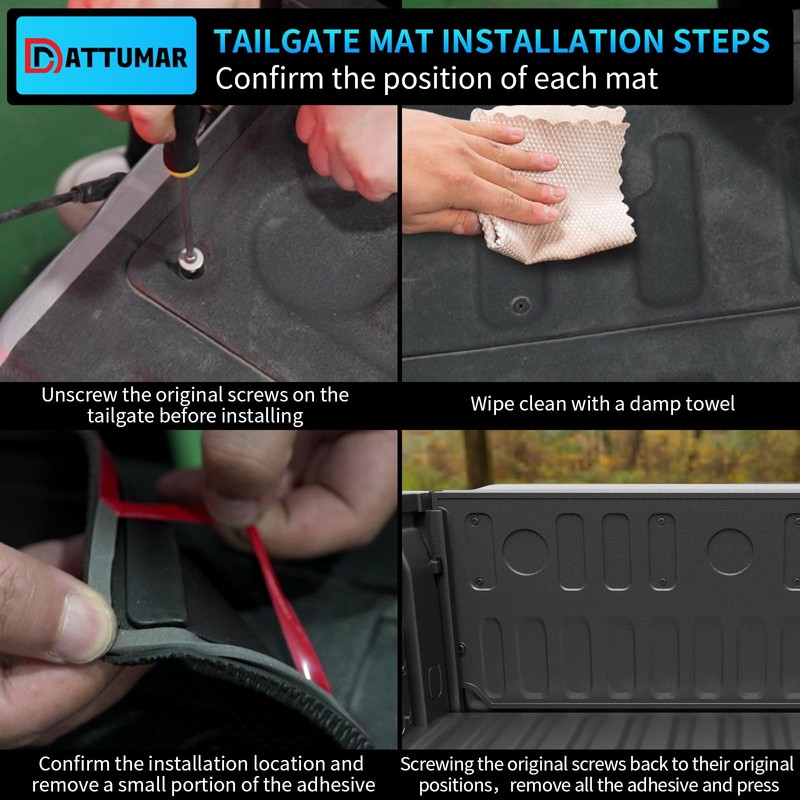 - Tailgate mat installation steps: First, unscrew all the screws on the tailgate, and then wipe the tailgate with a towel. Then Tear off the adhesion promoter and apply it evenly at the installation location. Then tear off a small portion of the adhesive strips in the four corners, place the mat on the tailgate and align it. Install all the screws that have been unscrewed back, then tear off all the adhesive strips and press them a few times to complete the installation.