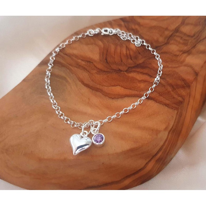 - Stunning puffy heart on a sterling silver 925 link chain, in sizes: 15cm & 17cm. Includes a pretty crystal birthstone in the birth month colour of your choice. The stones are crystal and represent the stone colour for each month.