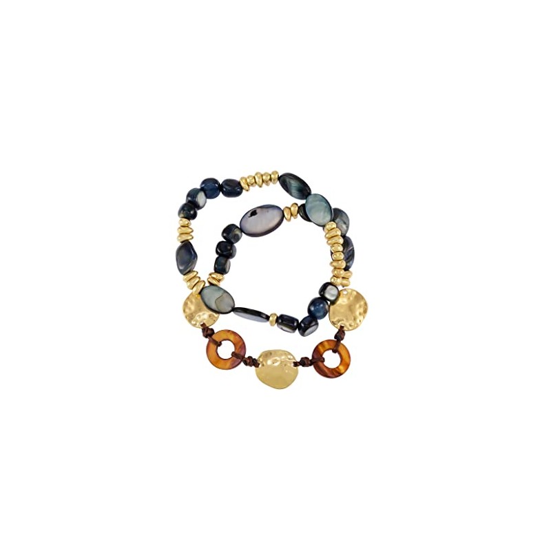 - BOHO ELEGANCE: The stackable beaded stone and gold bracelet set from Carol Duplaise showcases blue organic shaped gems with intervals of gold beads and is finished with hammered gold discs, brown orbits, and rope accents.