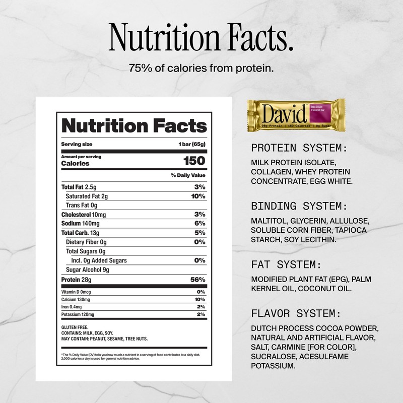 - GLUTEN FREE BARS – David protein bars are designed for performance, delivering 28g of high-quality protein with 0g of sugar and 150 calories. Whether you’re fueling up pre-workout, recovering post-gym, or need a quick on-the-go snack, these gluten free bars help you stay on track with your macros - without compromising on taste.