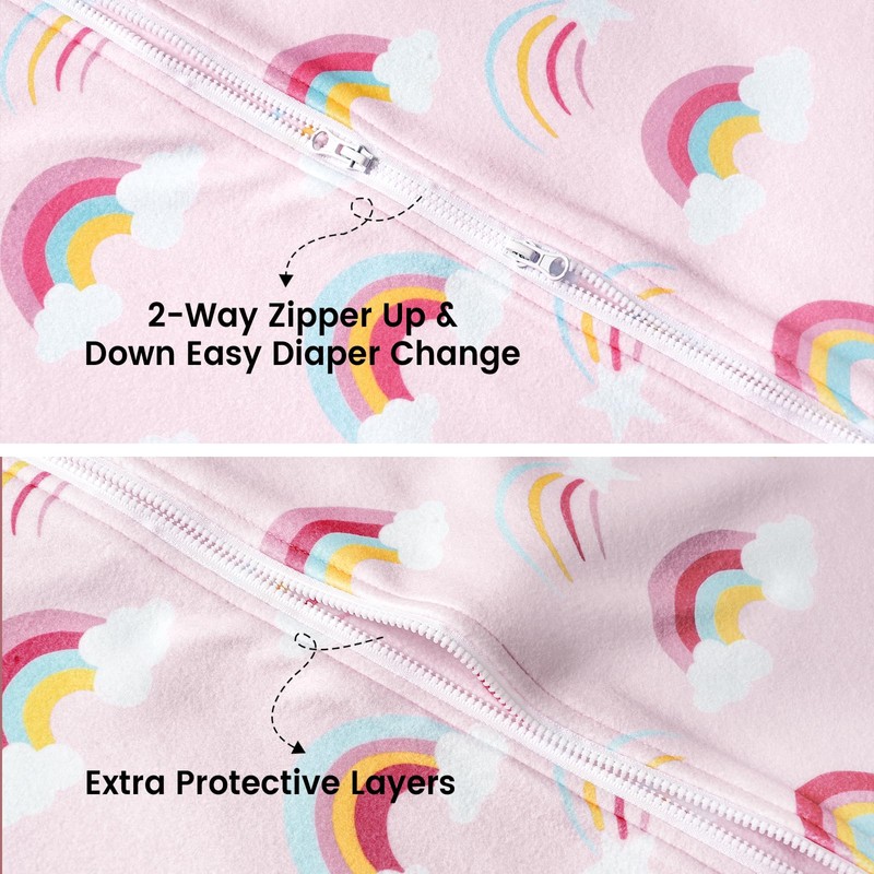 - Generous Bottom Space and 2-way Zipper: Our sleeping bags have generous bottom space that allows your baby to kick and move their legs freely. The 2-way zipper makes it easy for you to change your baby's diaper. Our sleep sacks come with protective layers that prevent the zipper from accidentally scratching your baby. The sleeveless design allows free movement of your baby's arms, making it easier for them to roll over and sleep comfortably.