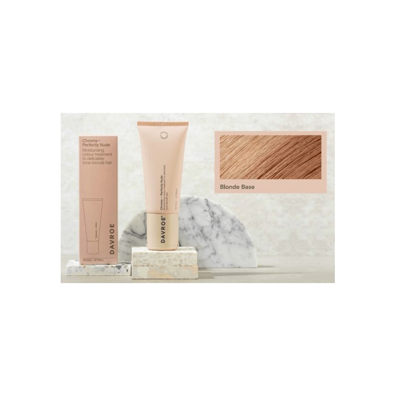 Davroe Chroma Colour Treatment - Perfectly Nude 200ml is a moisturizing colour treatment that delicately tones blonde hair, leaving it with a creamy hue while removing warm gold tones and improving hair strength.