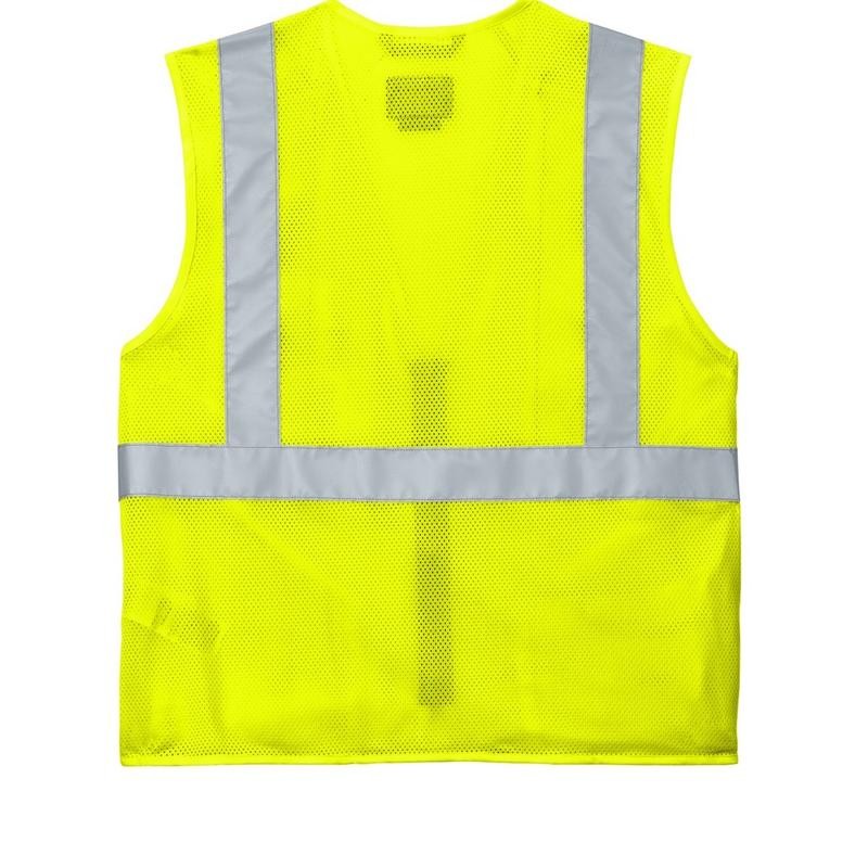 Built to last, this lighter weight mesh vest works well in warm weather or it can be a high visibility layer over your favorite shirt, long slesleeve or hoody Jacket 4-ounce, 100% polyester mesh Meets ANSI 107 Class 2, Type R visibility standards Triple-stitched main seams Zippered front closure Utility band at right shoulder Left chest pocket with pen stall Two tricot fabric lower-front pockets with secure hook and loop closures Carhartt label sewn on top left pocket Reflective material maintains performance through 50 home launderings This garment must be fully zipped to be in compliance with ANSI/ISEA 107