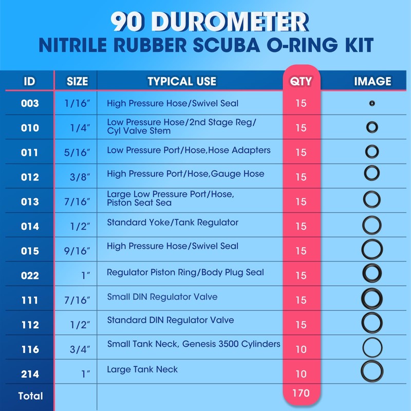 - Multiple Sizes: There are 170 diving O-ring suits, which are divided into 12 different sizes for scuba diving(15 pcs of each most-used size: 003/1/16”, 010/1/4”, 011/5/16”, 012/3/8”, 013/7/16”, 014/1/2”, 015/9/16”, 022/1”, 111/7/16”, 112/1/2”; 10 pcs of each size:116/3/4”, 214/1”).