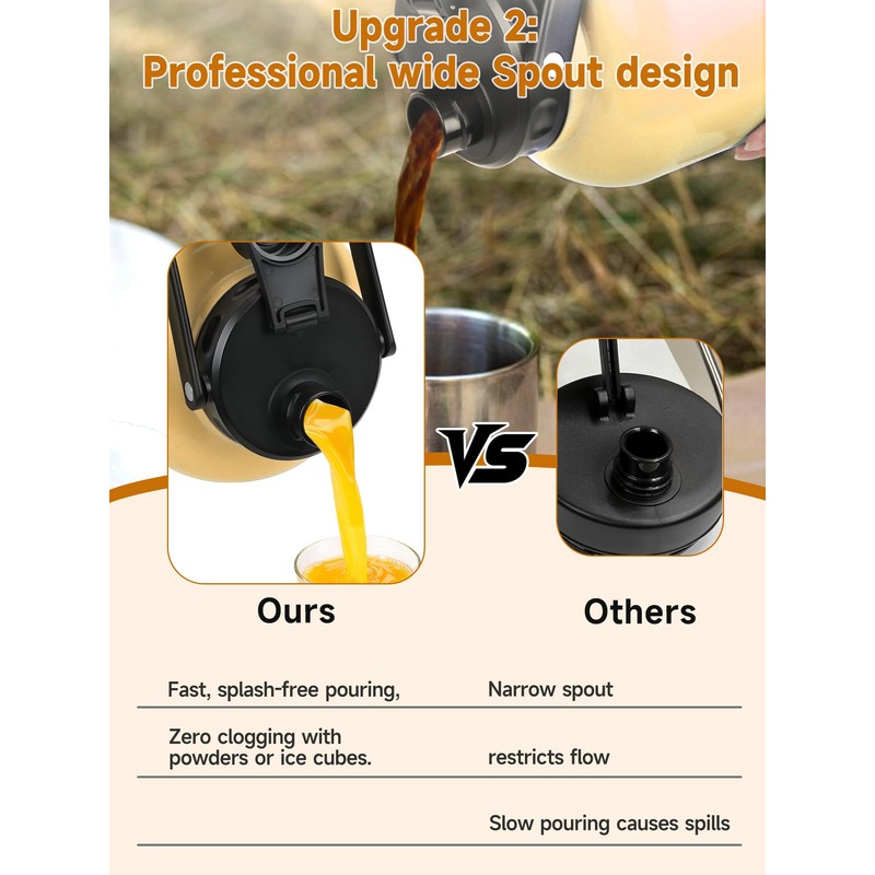 - Ultra-Wide Spout for Splash-Free & Fast Pouring – No Clogs - Enjoy smooth, fast, and mess-free pouring with our professionally designed wide-mouth spout. Pour water, ice, or protein powder effortlessly without splashing or clogging — perfect for post-workout refuels, camping, and outdoor use.