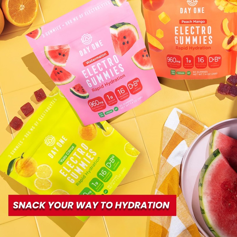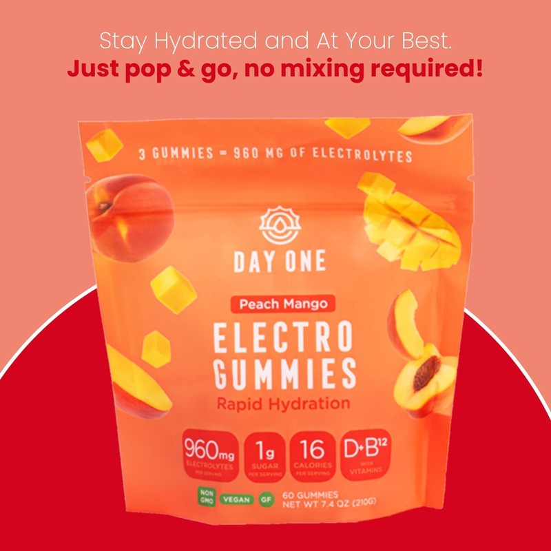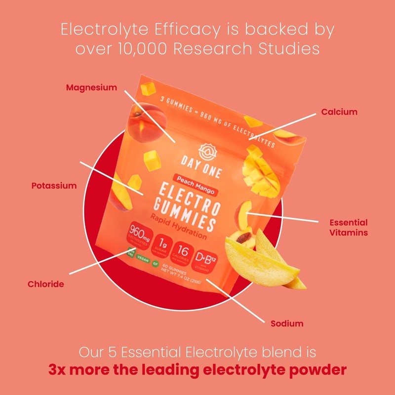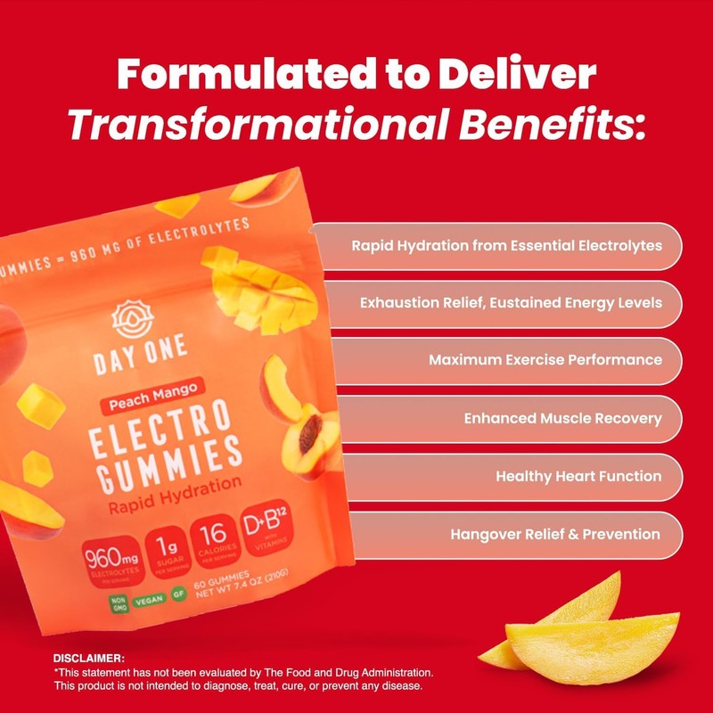 Day One ElectroGummies – Electrolyte Hydration Gummies – Ideal to Boost Hydration & Energy – Supplement for Post & Pre Workout – for Men, Women, Kids – Peach Mango Flavored – 60 Gummies