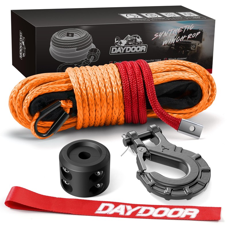 DAYDOOR DAYDOOR Synthetic Winch Rope, 1/4' x 50ft 10,000LBS Synthetic Winch Line, Synthetic Winch Cable for Offroad Vehicle 4WD ATV UTV, Synthetic Rope with Forged Winch Hook and Rubber Stopper (Orange)